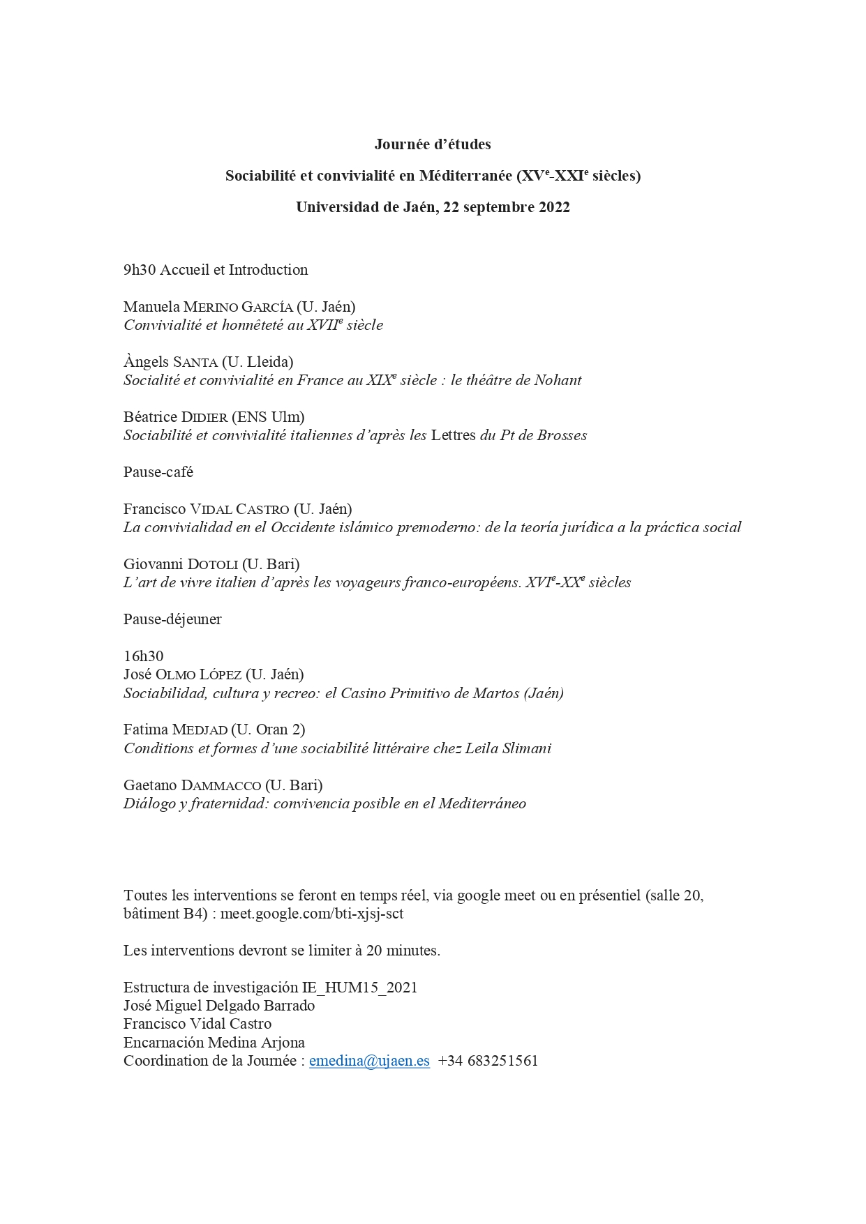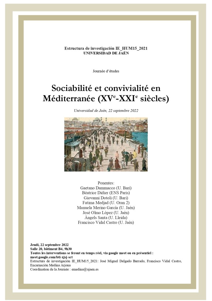 Journée d’études SOCIABILITÉ ET CONVIVIALITÉ EN MÉDITERRANÉE, Universidad de Jaén 22/09/2022 18 domingo Sep 2022 Posted by Encarnación Medina Arjona in Viajes ≈ Deja un comentario Relacionado